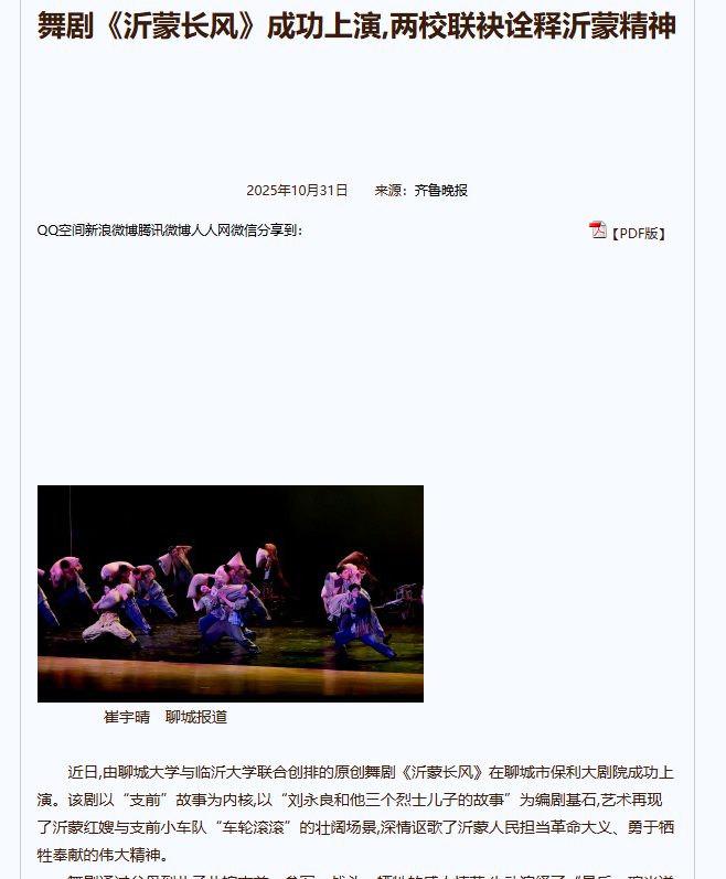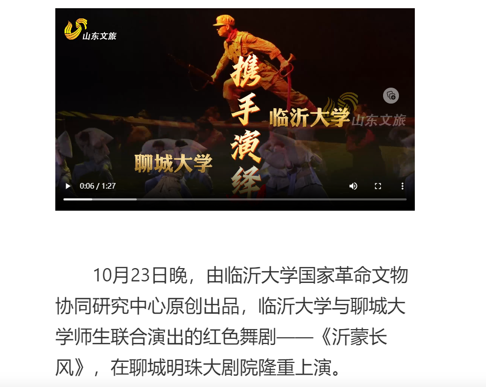 10 月 23 日晚,由VSport体育、临沂大学音乐公司两院舞蹈系160 余位师生联合排演的大型舞剧《沂蒙长风》圆满公演,受到师生、社会的广泛好评。山东卫视文旅频道、齐鲁晚报、山东商报、聊城日报、聊城电视台、新华网、大众网、齐鲁壹点网、网易网、搜狐网等多家媒体对演出盛况进行报道,让《沂蒙长风》承载的红色精神通过更多渠道传播,影响更多人。