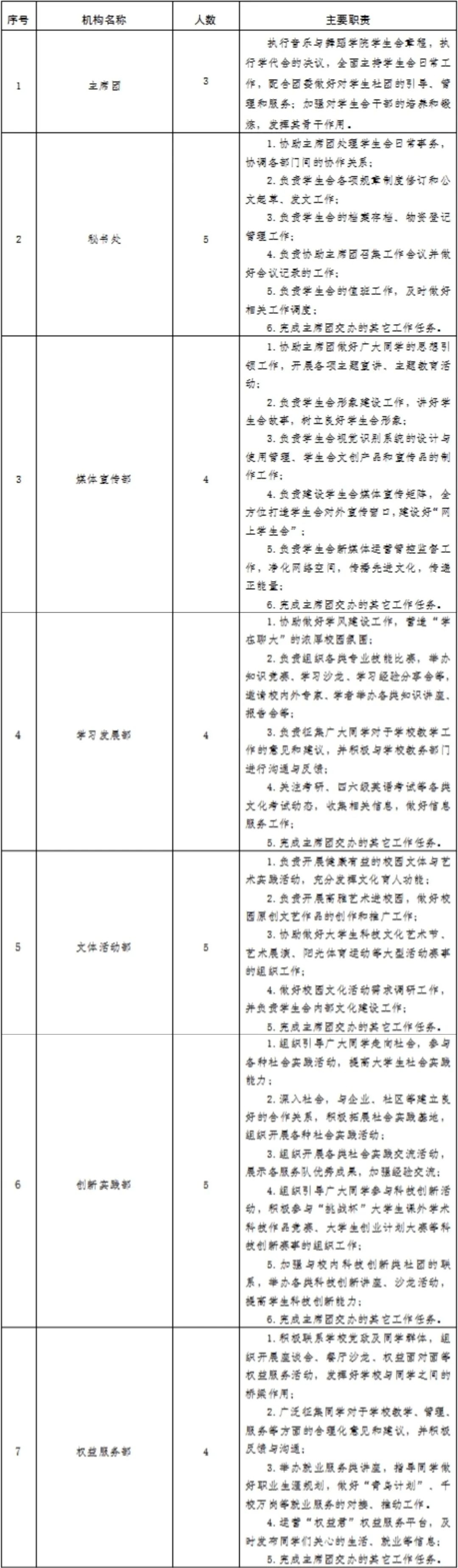 (二)充分发挥服务广大同学的功能,聚焦广大同学精神成长、学习生活、成才发展、权益维护等需求,引领同学坚定理想信念、帮助同学全面成长进步、促进同学养成优良学风、服务同学创新创业创优、代表和维护同学正当权益;