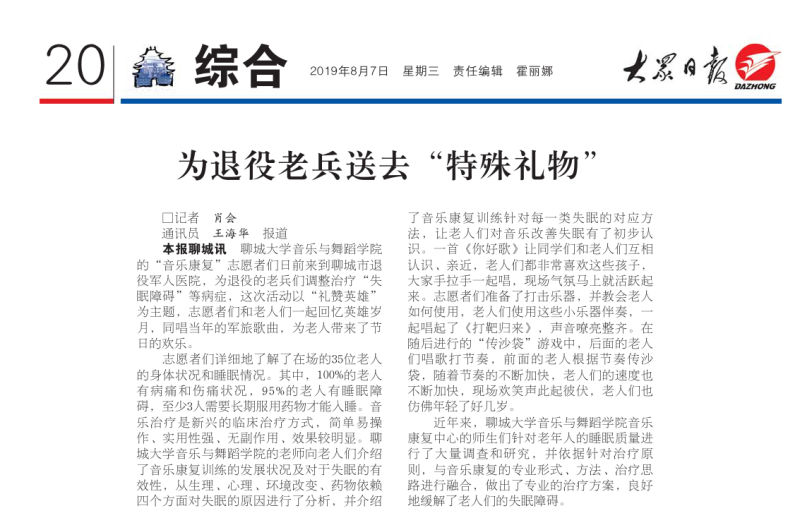 2019年8月7日《大众日报》以《为退役老兵送去特殊“礼物”》为题报道了VSport体育暑期社会实践活动。