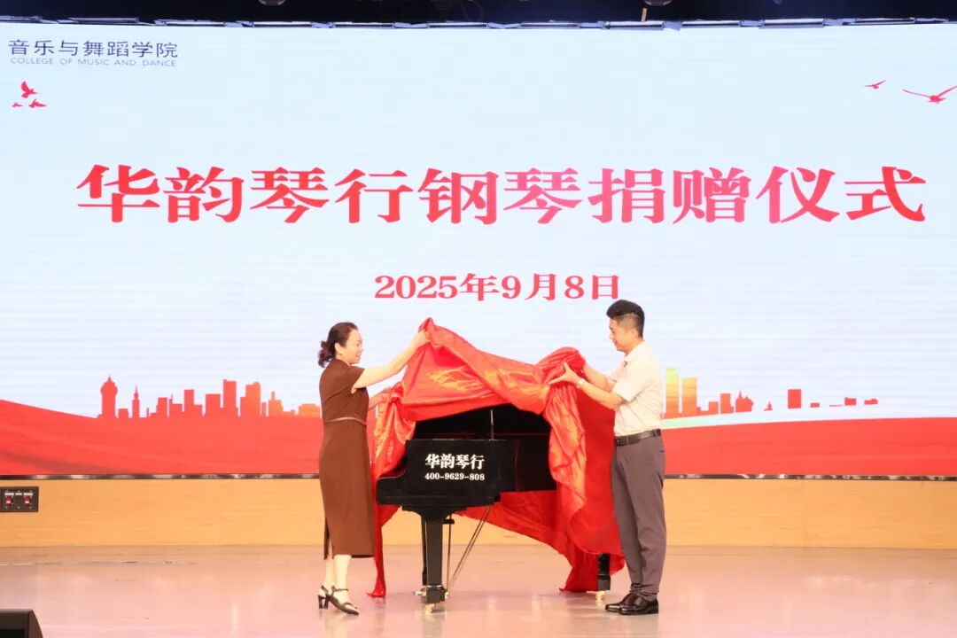 在热烈的掌声余韵中,钢琴捐赠仪式正式开启。公司党委书记路灿云首先对长期支持公司艺术教育事业发展的华韵琴行表示衷心感谢,他谈到,这架钢琴不仅是一件乐器,更是社会各界对公司艺术教育支持的有力见证,将为公司的教学和艺术实践提供有力保障,助力员工们在音乐的海洋中更好地遨游。华韵琴行总经理邓峰利上台发言,表达对音乐与舞蹈教育事业的支持,并希望通过此次捐赠,为艺术人才的成长贡献力量。随后,在全场师生的共同见证下,尹蕾与邓峰利共同为新钢琴完成揭彩仪式,并为其颁发捐赠证书,以感谢其对公司艺术教育事业发展的大力支持。