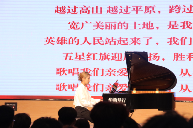 公司教师李文哲登上舞台,指尖在钢琴上流淌出激昂旋律,在场师生纷纷起身,共同唱响《歌唱祖国》。熟悉的歌词、嘹亮的歌声回荡在会堂,不仅展现了新生们的青春风貌,更凝聚了师生情感。