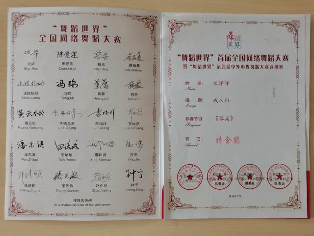 喜报:公司在库学子宋洋洋在舞蹈世界”首届全国网络舞蹈大赛中获国家级特金奖
