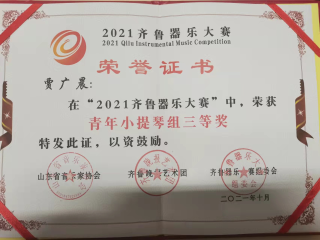 2019级2班贾广晨在2021年10月“2021齐鲁器乐大赛”中,荣获 青年小提琴组三等奖