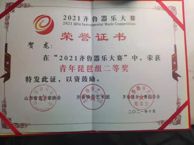 2018级5班贺龙在2021年10月在“2021齐鲁器乐大赛”中,荣获青年琵琶组二等奖