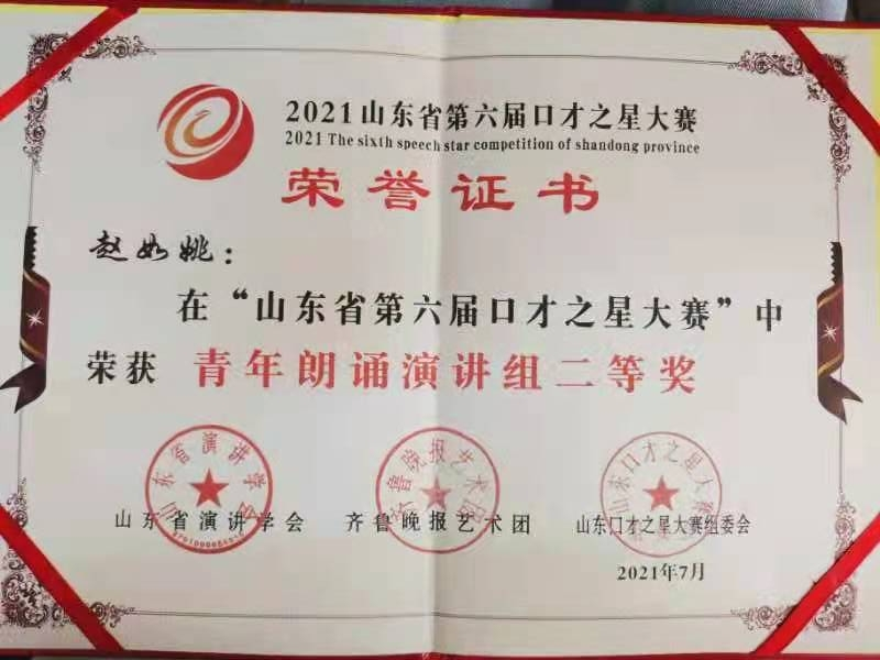 2018级5班赵如姚在2021年7月获得山东省第六届口才之星大赛中获得青年朗诵演讲组二等奖