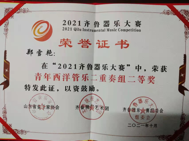 2019级8班郑雪艳在2021年10月“2021齐鲁器乐大赛”中,荣获 青年西洋管乐二重奏组二等奖