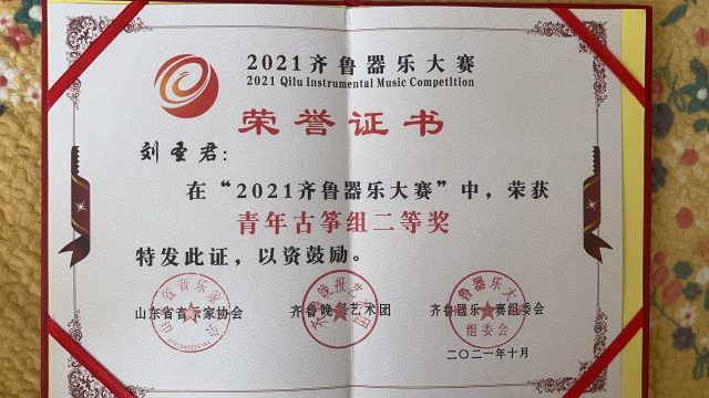 2019级5班刘圣君在2021年10月“2021齐鲁器乐大赛”中,荣获青年古筝组二等奖