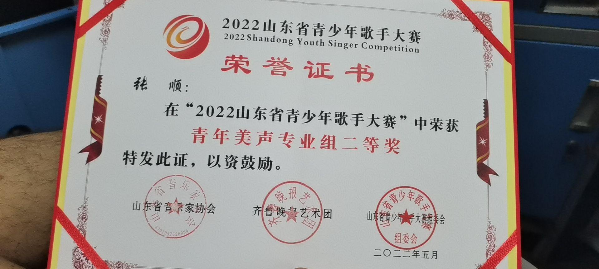 VSport体育张顺在”2022山东省青少年歌手大赛“中荣获青年美声专业组二等奖