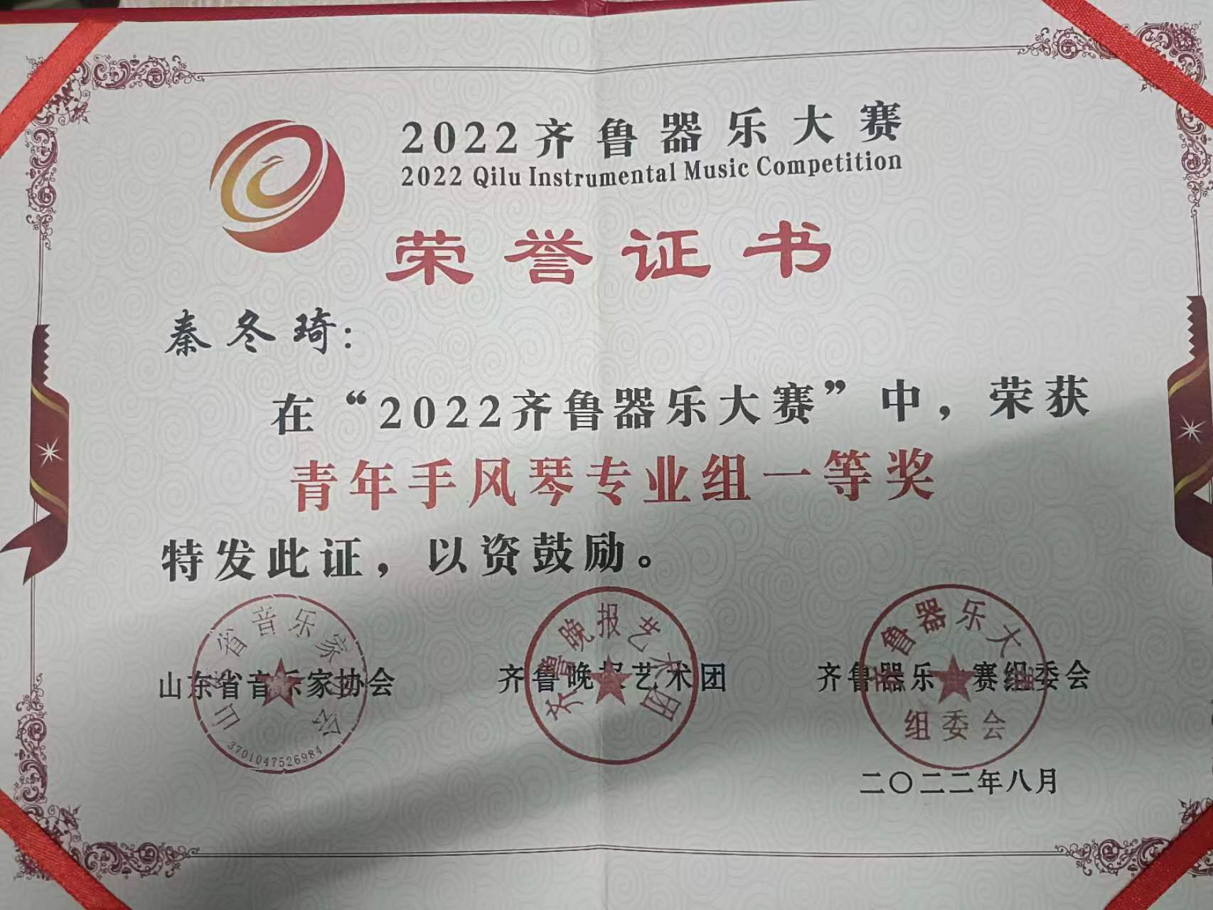 VSport体育秦冬琦在“2022山东省齐鲁器乐大赛”中荣获青年手风琴专业组一等奖
