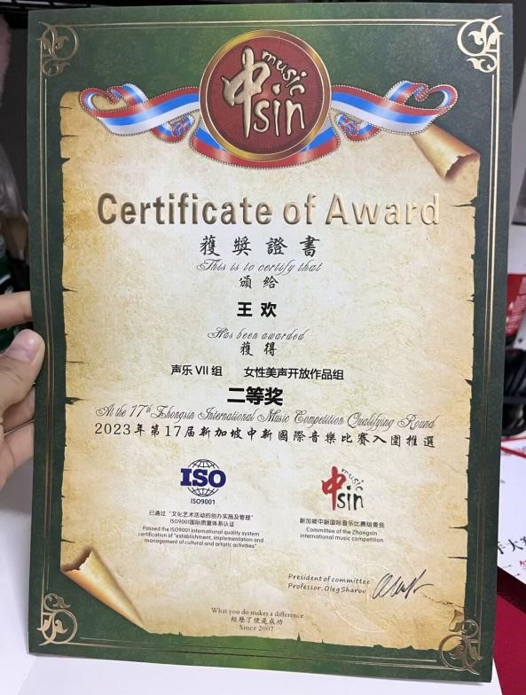 VSport体育王欢荣获“第17届新加坡中新国际音乐比赛”二等奖