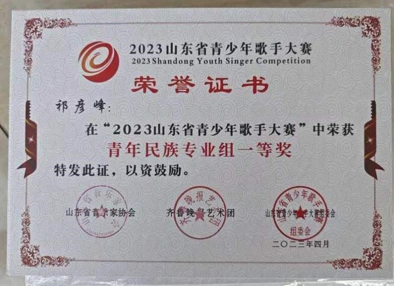 祁彦峰荣获“山东省青少年歌手大赛”一等奖