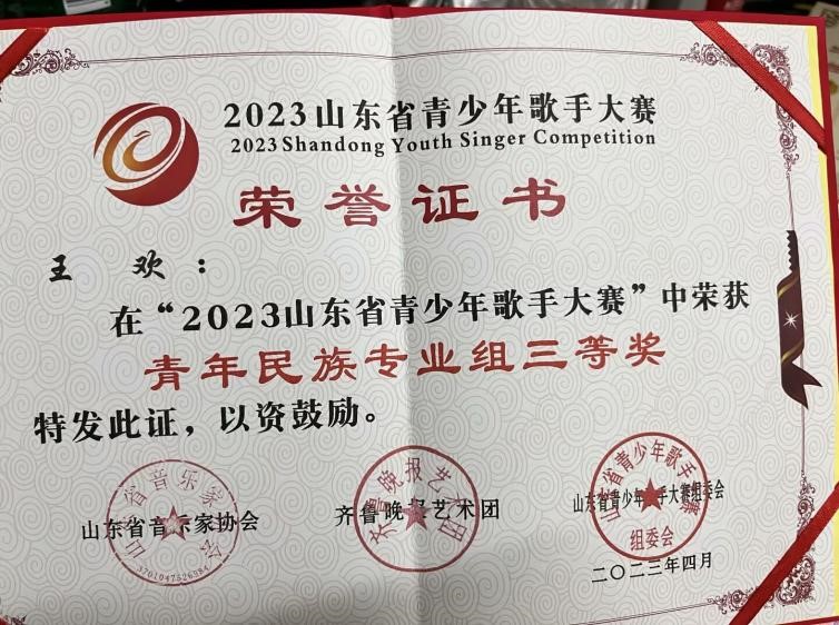 王欢荣获“山东省青少年歌手大赛”三等奖