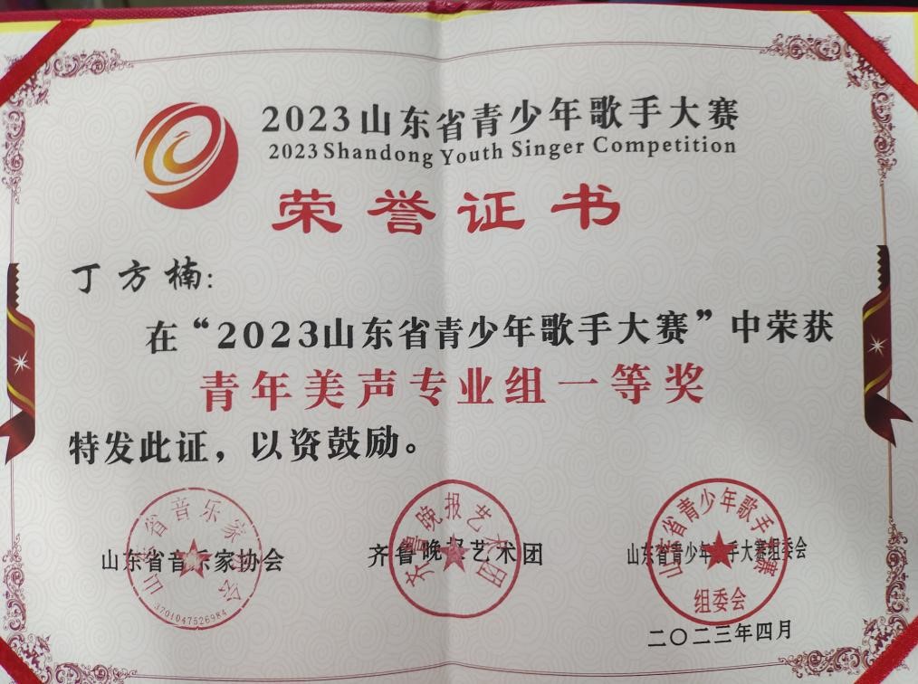 丁方楠荣获“2023山东省青少年歌手大赛”青年美声专业组一等奖