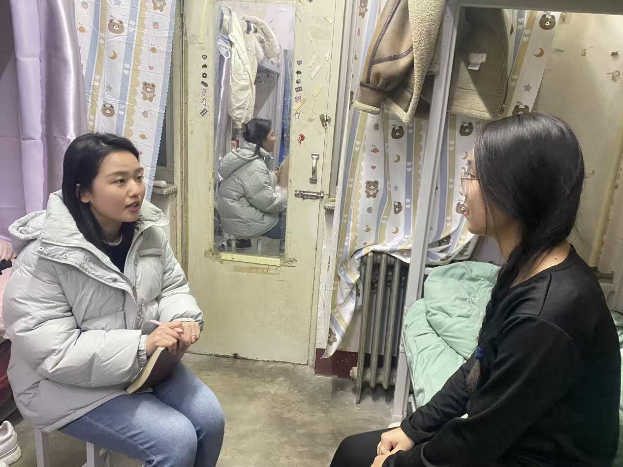 岳圆来到了员工宿舍,宿舍内,几名员工正在整理着自己的学习和生活用品,见到辅导员老师的到来,他们纷纷起身迎接,脸上洋溢着感激之情。