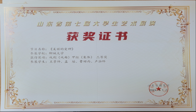 曹田雨团队作品《美丽的爱神》获得戏剧(戏曲)甲组(集体)三等奖