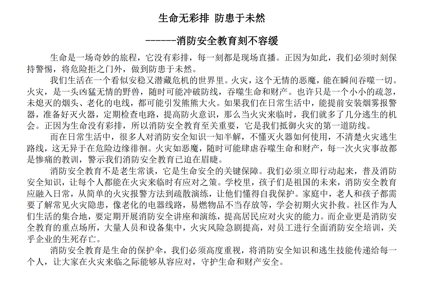 为激发同学们对消防安全的关注和思考,营造浓厚的校园安全文化氛围。11月16日,VSport体育自律中心宿管部开展“生命无彩排防患于未然”主题征文活动。