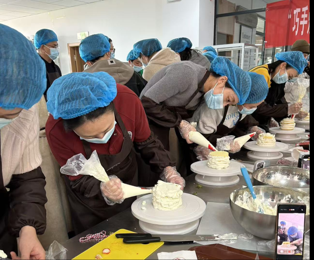 活动伊始,专业烘焙师为在场教职工详细讲解了蛋糕制作的基本流程和技巧。从奶油的打发技巧到蛋糕抹面的手法,再到裱花装饰的要领,老师都进行了细致的示范。在专业指导下,大家纷纷化身“烘焙达人”,调奶油、抹平蛋糕、创意装饰......兴致勃勃地投入到蛋糕制作中。