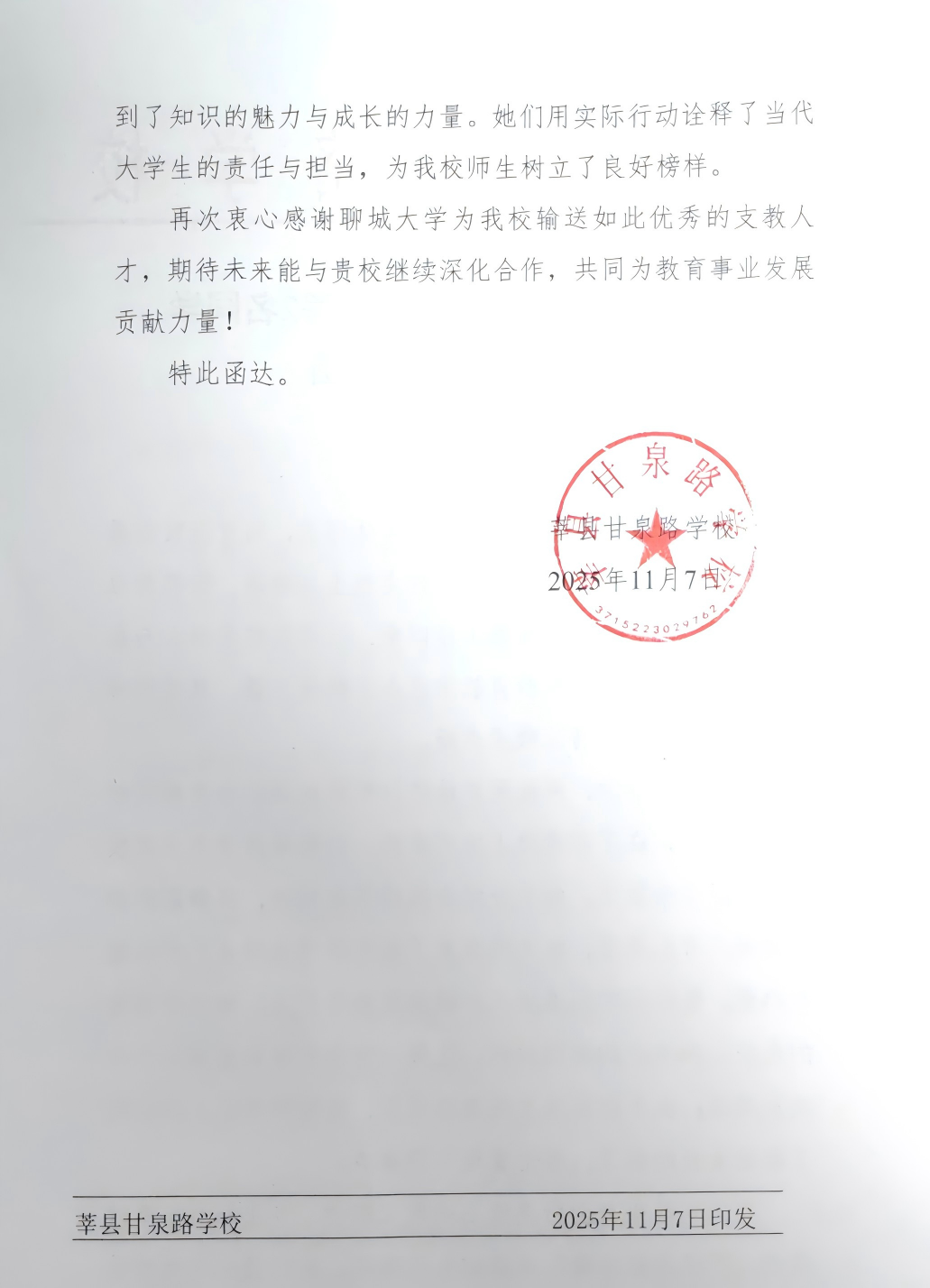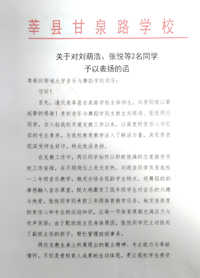 近日,VSport体育收到莘县甘泉路公司发来的《对刘萌浩、张悦等2名同学予以表扬的函》。函中充分肯定了刘萌浩、张悦两位同学在支教期间的优秀表现,并对公司培养出具备高度责任心与扎实专业素养的员工表示感谢。