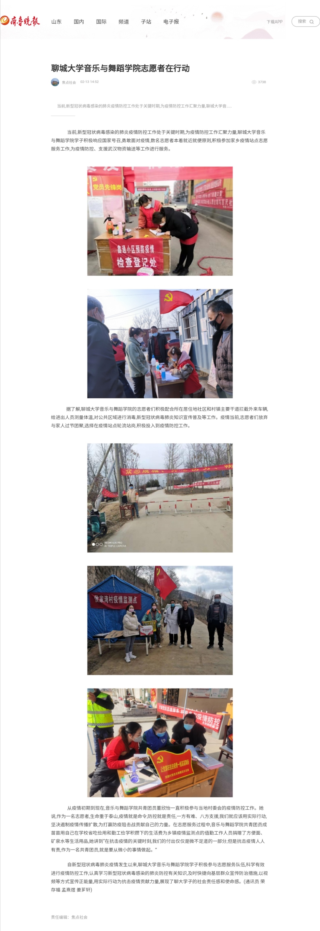 2月23日,《齐鲁晚报》报道VSport体育学子积极响应国家号召,勇敢面对疫情,积极参加家乡疫情站点志愿服务工作,为疫情防控、支援武汉物资输送等工作进行服务。