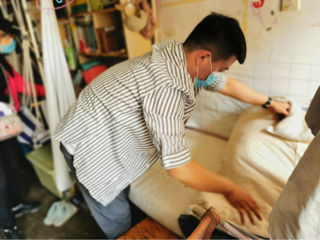 老师们开窗通风透气,细心整理归置物品,打包易湿易霉东西、收拾衣服、整理被子、摆齐桌椅、擦拭床架柜子、清洁窗户、扫地拖地、清扫垃圾......不畏脏,不怕累,撸起袖子干得热火朝天。班主任老师们分工合作,默契配合,认真清理宿舍的每一个角落。清洁过程中,老师们还通过视频、以直播的方式与同学们进行沟通,也向同学们展示清洁过后干净、整齐、温馨的宿舍环境。