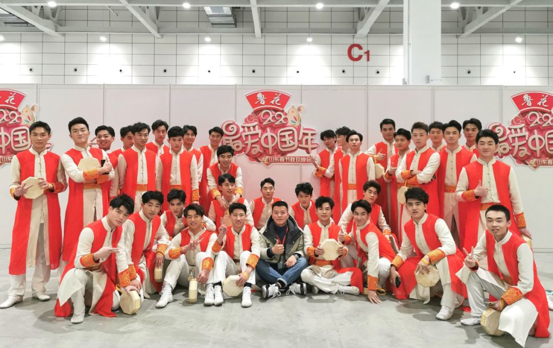 “推门的时候一定要注意速度,还有方向,咱们一定要推到舞台侧面,不要推歪了!咱们兄弟们一块儿加油!” 2019舞蹈员工周贺嵩不断给伙伴们加油打气,打磨舞蹈动作细节,在春晚录制期间他还接受了山东电视台齐鲁网闪电新闻对2020山东春晚微记录的采访,采访中他说自己从一名观众,到山东春晚的参与者,逐渐对春晚有了全新的认知,作为舞蹈专业的他迅速进入角色,一遍遍跳起鼓子秧歌,一次次彩排成为习惯,只为呈现最好舞台。