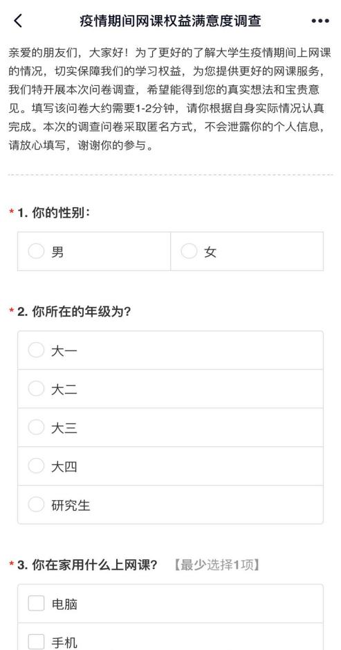 活动采用问卷调查的形式开展,此问卷所设置的问题,均贴近同学们的真实情况,真正从同学们的角度进行考虑和研究,以确保结果的真实有效性。根据问卷平台显示的结果可以看出,绝大部分同学都可以适应网络授课,按时上课,认真完成课后作业并及时整理笔记。有些同学认为网络原因,会影响听课效果,也有些同学会出现注意力不集中,不能及时跟住老师的思路等问题。对于网课,同学们要清楚自己需要什么,目前的学习科目种类繁多,大家要学习广泛的知识,就需要同学们抓住重点,及时参与老师的互动,真正意义上把握“停课不停学”的精髓,做到“勤不怕苦,阅不畏倦”。