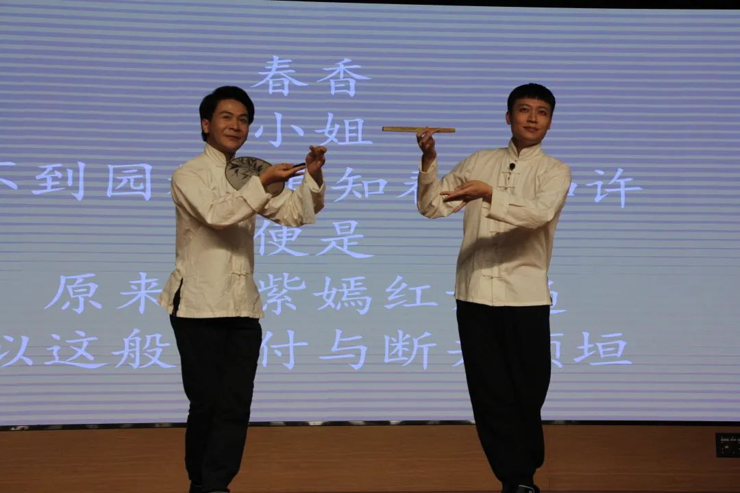 开讲前,山东省艺术研究院代表冯丽娜向公司赠书,并与宗传军就高校美育工作进行交流。随后,金谷老师通过讲、演结合的方式为大家诠释戏曲与当代每个人的气质、气场之间的关系,剖析经典戏曲中的功法、戏文、美学等内容,教授古法戏曲里沉淀下来益于人们“修身养性”的方法和智慧以及传统古典的中庸之美。金谷从气息、发声、眼神、指法、台步五个方面,带领大家了解与练习戏曲基本功,告诉大家学习戏道,锻炼身心,开发智慧,收获喜悦。同时使自身气质与气场得到提升。最后,金谷通过《牡丹亭》中的游园、惊梦两个唱段,为大家展示了戏曲的魅力,在场观众传来阵阵掌声。