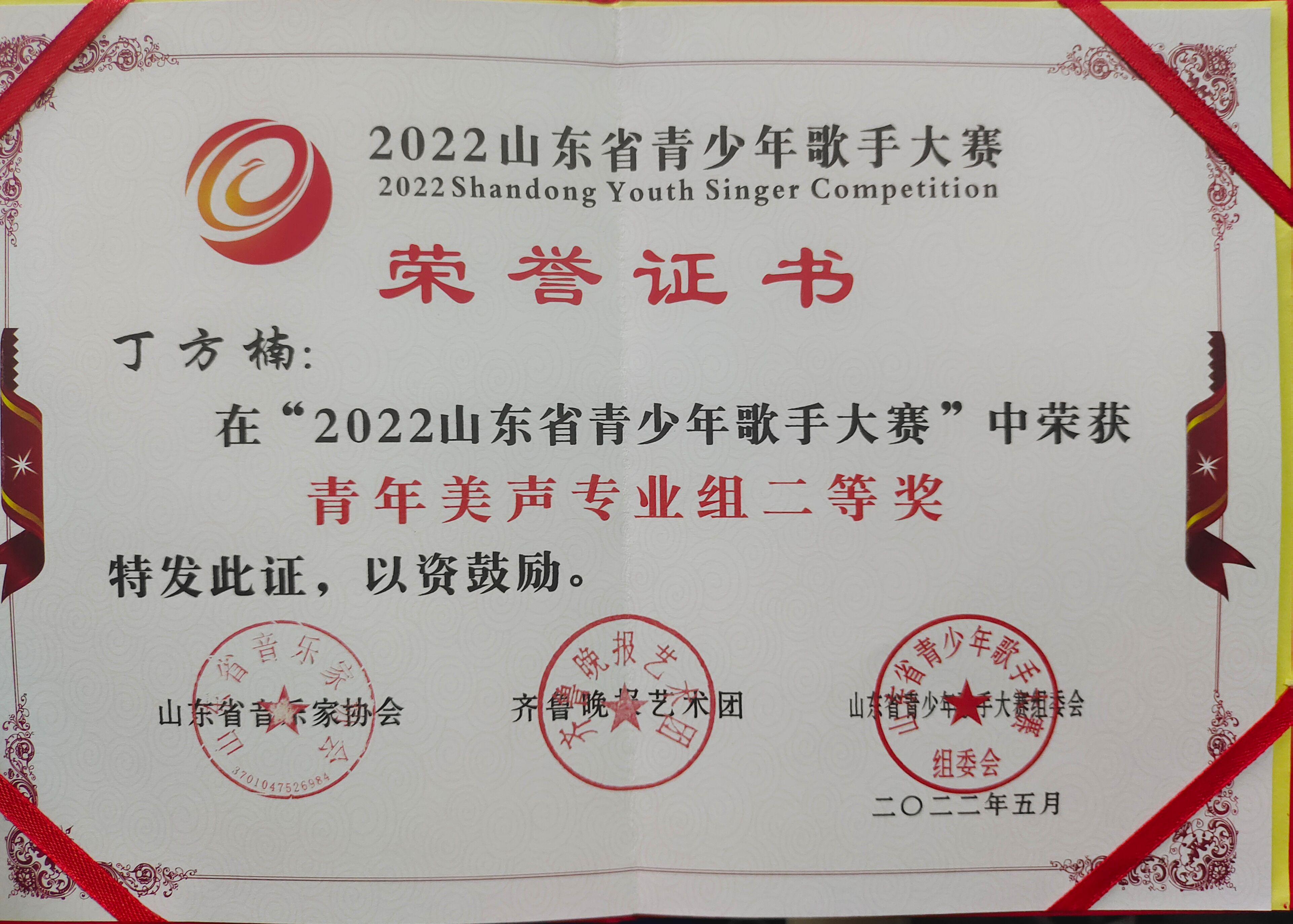 丁方楠在2022山东省青少年歌手大赛中,荣获青年美声专业组二等奖。