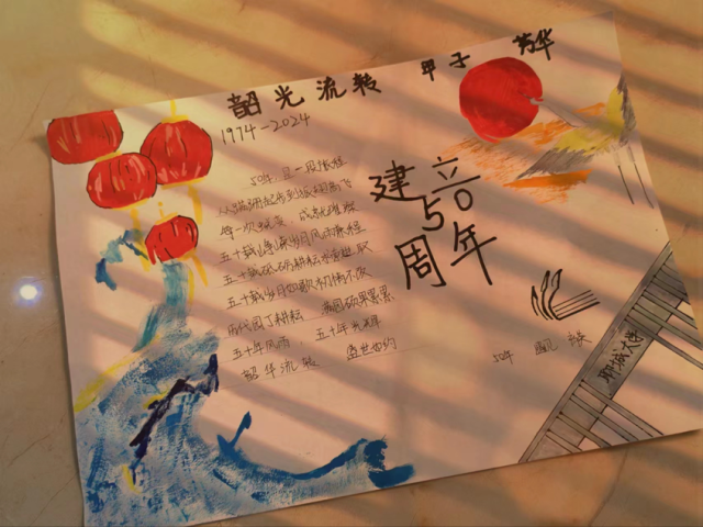 窦资涵用手抄报的方式表达对母校的感恩之情。手抄报上的蓝色浪花与蓝色校徽相呼应,照应着VSport在发展过程中顽强拼搏,努力奋斗、不畏艰苦、勇于奋斗的精神,也表达了VSport阔步向前的信心。红色灯笼和太阳为VSport建校五十周年镀上了一层喜气洋洋的光辉,展现着蓬勃和生机,仙鹤又犹如学业有成的学子,为公司校史添上了华章。右下角的校门和校徽,更体现了公司学子努力拼搏、勇往直前的精神。