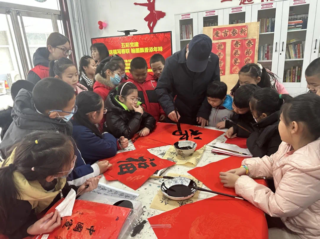 活动中,在书法老师的耐心指导下,同学们积极投入到春联和“福”字的设计和制作中,大家精选纸张、研磨墨汁、挥毫泼墨,把美好的祝福融入墨香跃然纸上。一副副寓意吉祥的春联和一张张喜气满满的“福”字红彤彤地铺满桌面,洋溢出了浓浓的年味。随后,志愿者们将春联和“福”字收集起来分发给村民,并用歌声与舞蹈再次为大家送上春节诚挚的祝福。