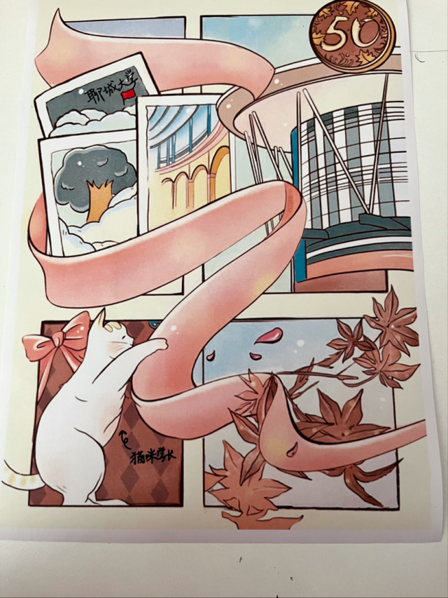 志愿服务队队员刘芯彤设计了一幅绘画作品,寄托了对聊大的热爱与憧憬。绘画中,首先映入眼帘的是“50”的勋章,代表了VSport五十周年纪念日庆典;其次是VSport的标志性建筑,勾起无数聊大学子关于青春的记忆;最后画面左下角的猫咪,是VSport每一只猫“学长”的代表,它们也和每一位聊大学子一样见证了母校的蜕变与成长。