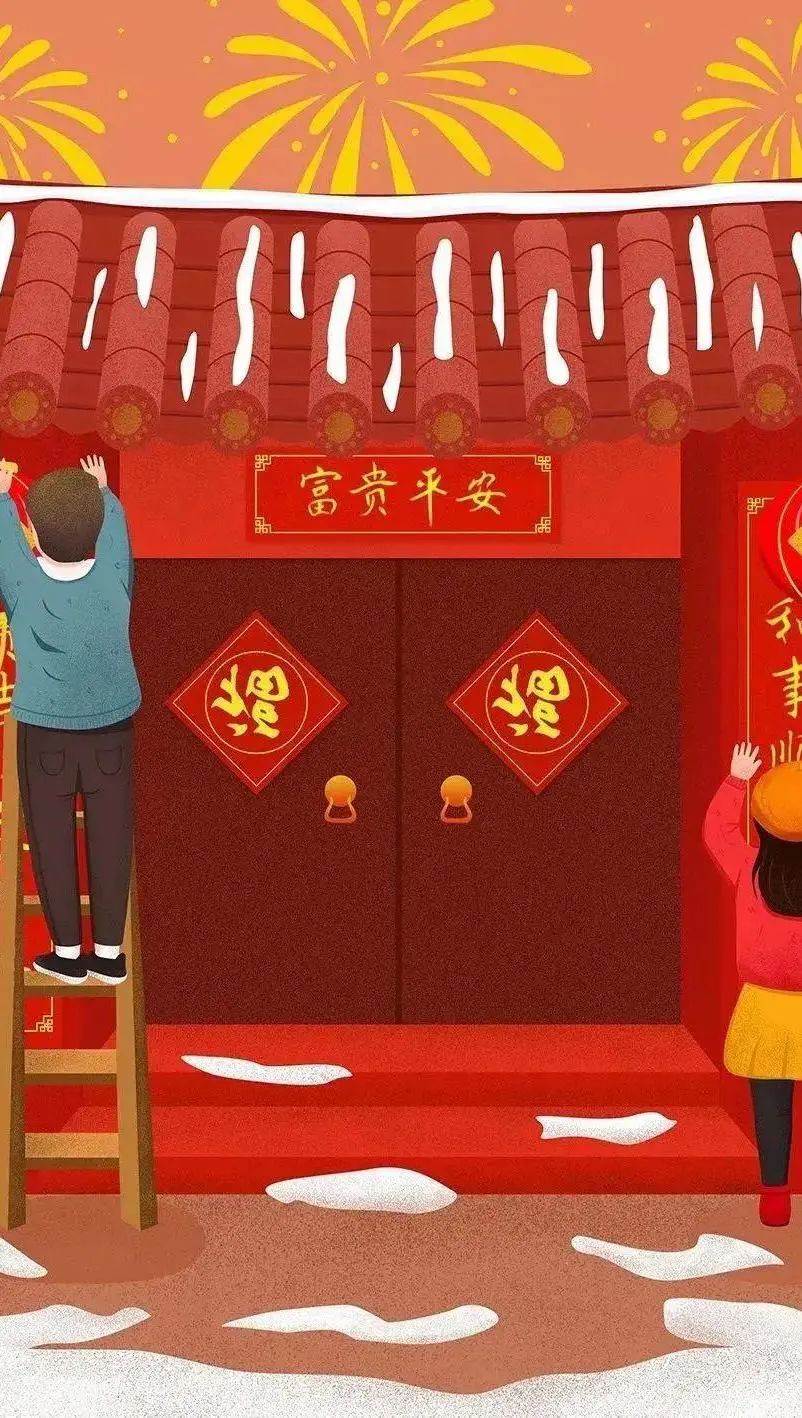 春联:贴春联也叫贴门对、春贴、对联、桃符等,表达了人们对新一年的美好愿景,是中国特有的文学形式。每逢春节,家家户户都要精心挑选一对大红春联贴于门上为节日增加喜庆气氛。