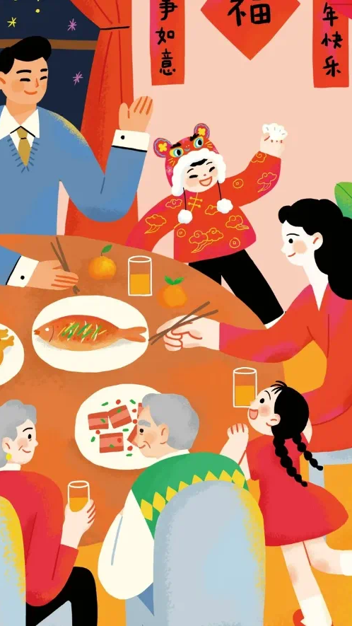 团圆饭: 除夕夜,人们会聚在一起吃一顿丰盛的团圆饭,这是春节最重要的习俗之一。辛苦奔波一年的人们在除夕来临之际回家与家人团聚。团年饭象征着家庭团圆和和睦,也表达了人们对新年的美好祝愿。