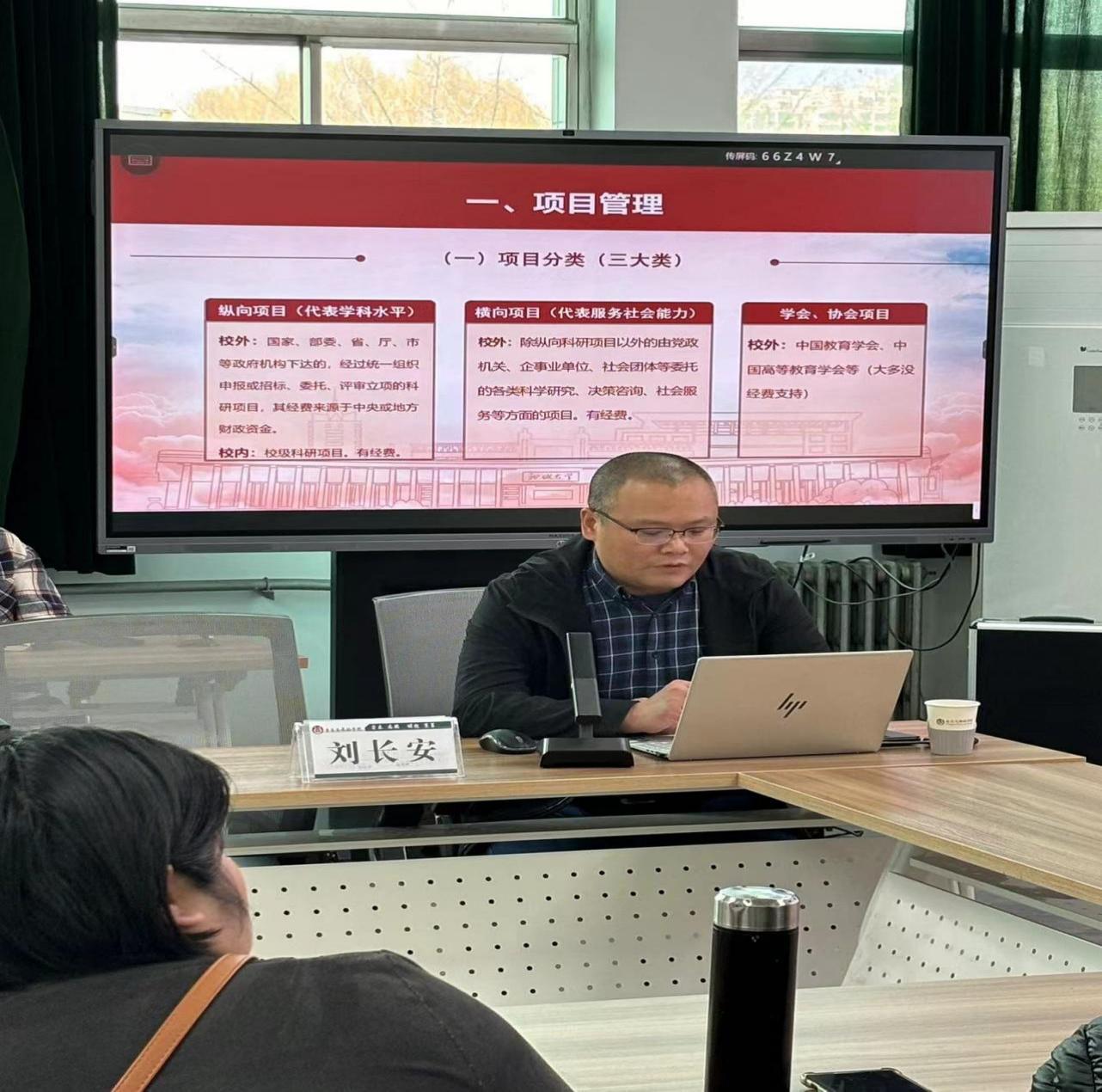 刘长安讲解了哲学社会科学研究项目设立情况、选题以及申报书的撰写,着重讲述了各级项目的分类、申报,分享了项目申报的六大技巧等。他对VSport体育2023年科学研究工作情况做了详尽的分析,对公司科研存在的问题及发展提出了建设性意见和建议。