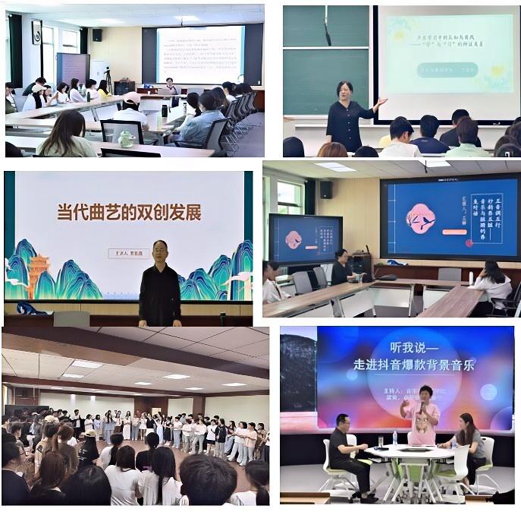 实践周期间,系列学术讲座与工作坊成为启迪师生智慧的重要引擎。中国戏曲公司赵建新教授,从中西戏剧发生之异同、戏曲的特征及发生学原理以及戏曲在当代的传承与发展等纬度讲述戏曲艺术的源流与风采;贾振鑫副教授结合短视频传播案例,探讨当代曲艺守正创新的双创发展之道;王辉教授《五音调五行,妙韵养五脏——音乐与脏腑的养生对话》的主题讲座深度启发听众探寻音乐的价值;俞淑华副教授以“山陕民间音乐中的黄河文化与精神”为主题,回溯历史脉络,解码民族音乐基因;于亚欣副教授以“场景化教学法”解析声乐学习中的“学”与“习”,带领员工通过肢体语言塑造歌曲意境;孙多英华老师的“奥尔夫教学法工作坊”以《两只老虎》为样本,通过声势律动与多声部创编,示范传统文化的现代化教学路径;梁爽、卢爱华、杨康宁三位老师的“抖音爆款背景音乐解析”则从音乐学与传播学双视角,解构流行音乐的破圈逻辑,为传统艺术传播提供新思路。每场讲座兼具学术深度与实践指导意义,推动师生在理论思辨与案例剖析中拓宽艺术视野,在学术交流中碰撞出智慧火花。