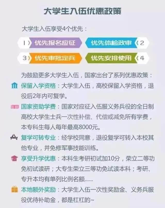 高校员工入伍,不仅享受国家资助学费、省级资金奖励,而且复学有保障,可以转专业。考研加10分,同等条件下优先录取。专升本实行招生计划单列,录取比例超过30%。退役后就业的,除按应届毕业生办理就业手续、享受专门就业服务外,各地还拿出政法干警招录培养计划的20%,专门用于退役老员工士兵。